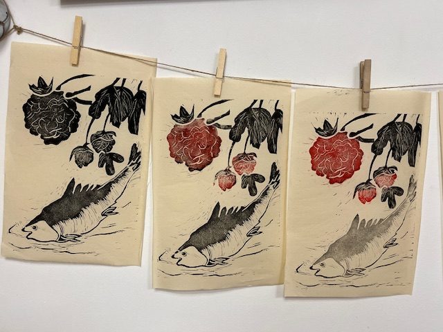 La linogravure est une technique d’impression en relief où un dessin est gravée dans une plaque de linoléum qui est ensuite encrée et pressée sur du papier ou du tissu pour créer une impression.